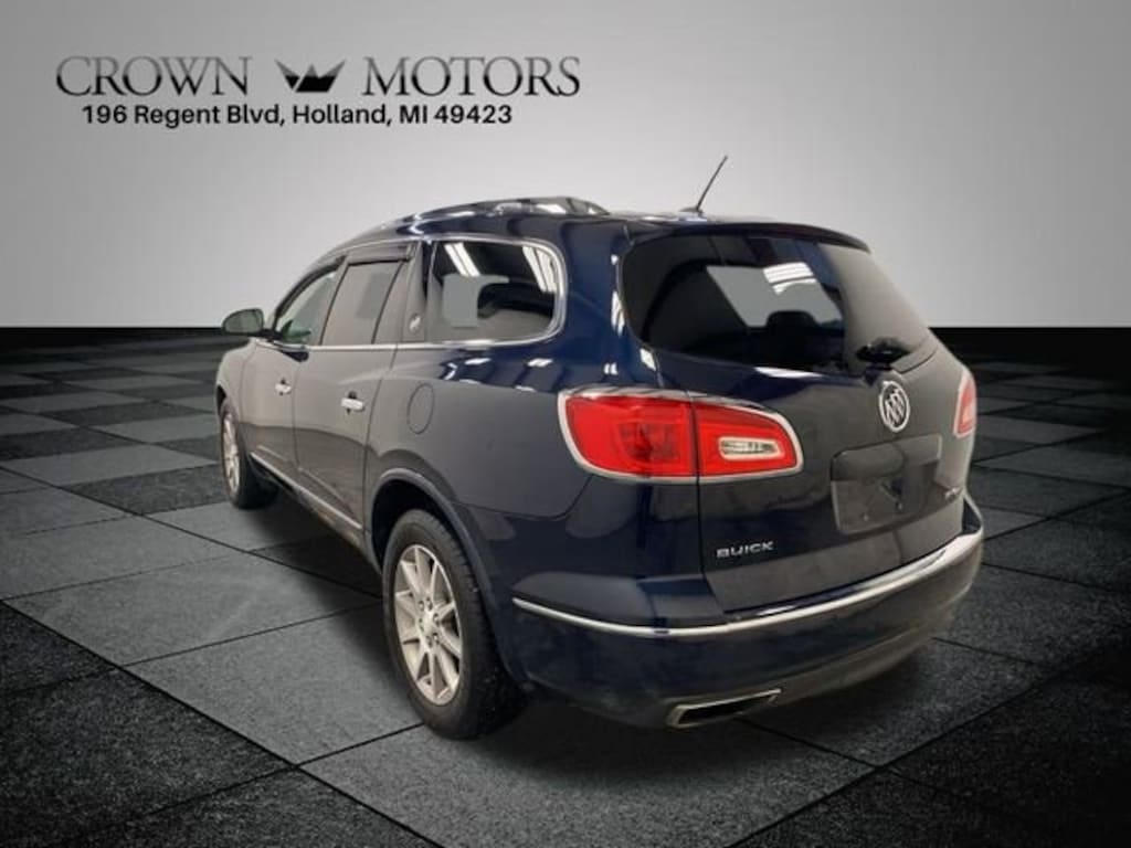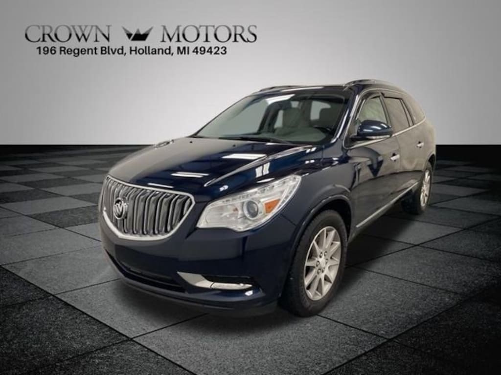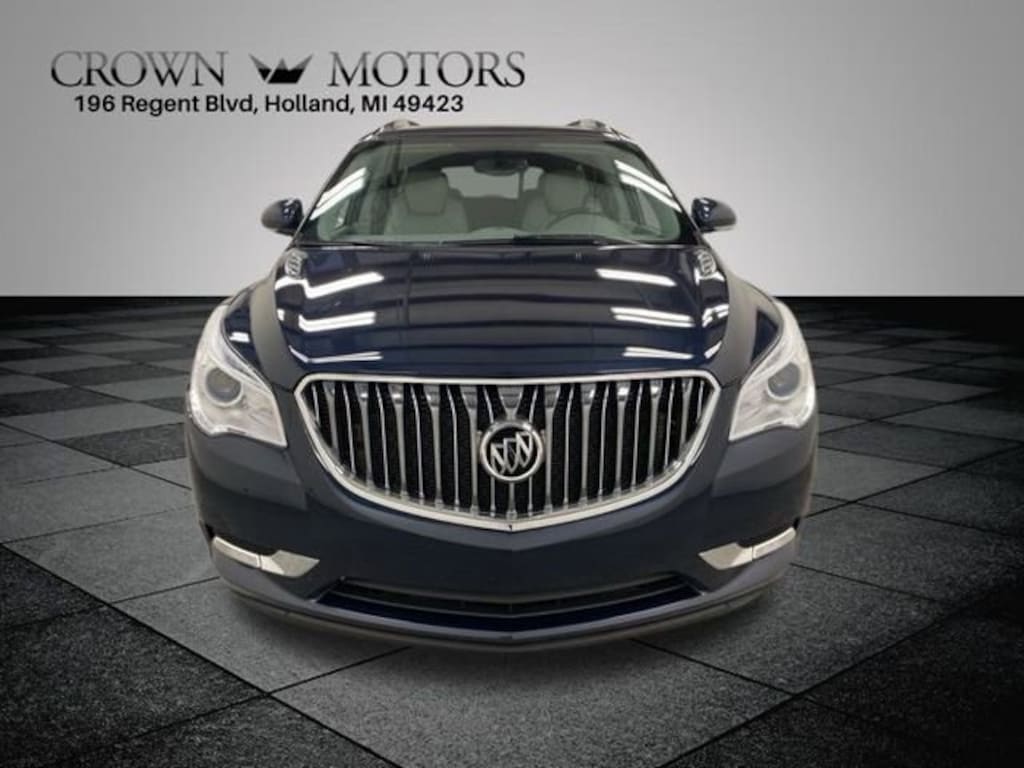 Dark Sapphire Blue 2015 Buick Enclave Leather Group AWD 6-Speed Automatic Electronic with Overdrive 3.6L V6 SIDI VVT **LOCAL TRADE IN**, AWD, 19" x 7.5" Aluminum (4) Wheels, 3.16 Axle Ratio, 3rd row seats: split-bench, 4-Wheel Disc Brakes, 6 Speakers, 7-Passenger Seating, ABS brakes, Air Conditioning, Alloy wheels, AM/FM radio: SiriusXM, Auto-dimming Rear-View mirror, Automatic temperature control, Bose Performance-Enhanced 10-Speaker System, Brake assist, Bumpers: body-color, CD player, Compass, Delay-off headlights, Driver door bin, Driver vanity mirror, Dual front impact airbags, Dual front side impact airbags, Electronic Stability Control, Emergency communication system: OnStar Directions & Connections, Exterior Parking Camera Rear, Four wheel independent suspension, Front anti-roll bar, Front Bucket Seats, Front Center Armrest w/Storage, Front dual zone A/C, Front License Plate Mounting Bracket, Front reading lights, Fully automatic headlights, Garage door transmitter, Heated door mirrors, Heated front seats, Heated steering wheel, High intensity discharge headlights: Bi-Xenon, Illuminated entry, Leather steering wheel, Low tire pressure warning, Memory seat, NavTraffic, Occupant sensing airbag, Outside temperature display, Overhead airbag, Panic alarm, Passenger door bin, Passenger vanity mirror, Perforated Leather-Appointed Seat Trim, Power door mirrors, Power driver seat, Power Liftgate, Power passenger seat, Power steering, Power Tilt-Sliding Moonroof, Power windows, Preferred Equipment Group 1SL, Radio data system, Radio: Color Touch AM/FM/CD w/IntelliLink, Radio: Color Touch AM/FM/CD/Nav w/IntelliLink, Rear air conditioning, Rear anti-roll bar, Rear Audio System Controls, Rear Parking Sensors, Rear reading lights, Rear window defroster, Rear window wiper, Remote keyless entry, Roof rack: rails only, Security system, SiriusXM Satellite Radio, Speed control, Speed-sensing steering, Spoiler, Steering wheel mounted audio controls, Tachometer, Telescoping steering wheel, Tilt steering wheel, Traction control, Trip computer, Turn signal indicator mirrors, Variably intermittent wipers, Voltmeter, AWD.