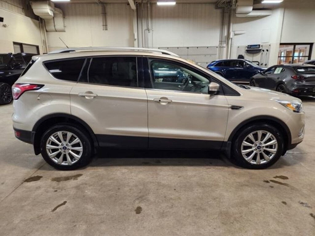 CARFAX One-Owner. White Gold 2018 Ford Escape Titanium 4WD 6-Speed Automatic EcoBoost 2.0L I4 GTDi DOHC Turbocharged VCT **LEATHER**, **LOCAL TRADE IN**, Escape Titanium, 4WD, 10 Speakers, 3.07 Axle Ratio, 4-Wheel Disc Brakes, ABS brakes, Adaptive Cruise Control & Fwd Collision Warning, Air Conditioning, Alloy wheels, AM/FM radio: SiriusXM, AppLink/Apple CarPlay and Android Auto, Auto High-Beam Headlamps, Auto-dimming Rear-View mirror, Automatic temperature control, Blind Spot Info System w/Cross-Traffic Alert, Brake assist, Bumpers: body-color, CD player, Compass, Delay-off headlights, Driver door bin, Driver vanity mirror, Dual front impact airbags, Dual front side impact airbags, Electronic Stability Control, Emergency communication system: SYNC 3 911 Assist, Equipment Group 400A, Exterior Parking Camera Rear, Ford Safe & Smart Package, Four wheel independent suspension, Front anti-roll bar, Front Bucket Seats, Front Center Armrest, Front dual zone A/C, Front fog lights, Front reading lights, Fully automatic headlights, Garage door transmitter, Heated door mirrors, Heated front seats, Heated Leather-Trimmed Front Bucket Seats, Heated steering wheel, High-Intensity Discharge Headlights, Illuminated entry, Knee airbag, Lane-Keeping System, Leather Shift Knob, Low tire pressure warning, Memory seat, Navigation System, Occupant sensing airbag, Outside temperature display, Overhead airbag, Overhead console, Panic alarm, Passenger door bin, Passenger vanity mirror, Power door mirrors, Power driver seat, Power Liftgate, Power passenger seat, Power steering, Power windows, Radio data system, Radio: AM/FM Stereo w/Single-CD/MP3 Player, Rain-Sensing Wipers, Rear anti-roll bar, Rear reading lights, Rear seat center armrest, Rear window defroster, Rear window wiper, Remote keyless entry, Roof rack: rails only, Security system, Speed control, Speed-sensing steering, Split folding rear seat, Steering wheel mounted audio controls, SYNC 3 Communications & Entertainment System, SYNC Connect, Tachometer, Telescoping steering wheel, Tilt steering wheel, Traction control, Trip computer, Turn signal indicator mirrors, Variably intermittent wipers, Voice-Activated Touchscreen Navigation System, Wheels: 18" Sparkle Silver-Painted Aluminum, Escape Titanium, 4WD.