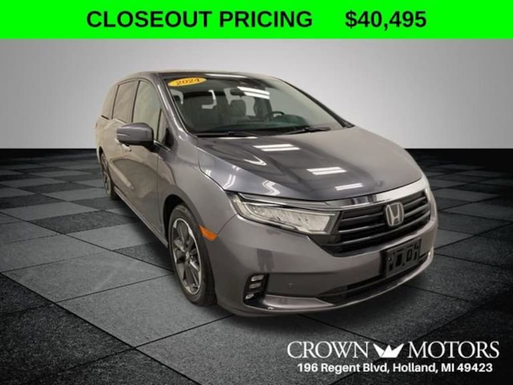 CARFAX One-Owner. Modern Steel Metallic 2024 Honda Odyssey Elite FWD 10-Speed Automatic 3.5L V6 SOHC i-VTEC 24V **ONE OWNER**, 11 Speakers, 3.61 Axle Ratio, 3rd row seats: split-bench, 4-Wheel Disc Brakes, A/V remote: CabinControl, ABS brakes, Adaptive Cruise Control: Adaptive Cruise Control (ACC) with Low-Speed Follow, Air Conditioning, Alloy wheels, AM/FM radio: SiriusXM, Anti-whiplash front head restraints, Apple CarPlay/Android Auto, Auto High-beam Headlights, Auto-dimming door mirrors, Auto-dimming Rear-View mirror, Automatic temperature control, Blind Spot Information (BSI) System warning, Brake assist, Bumpers: body-color, CD player, Compass, Delay-off headlights, Driver door bin, Driver vanity mirror, Driver's Seat Mounted Armrest, Dual front impact airbags, Dual front side impact airbags, DVD-Audio, Electronic Stability Control, Emergency communication system: HondaLink, Exterior Parking Camera Rear, Four wheel independent suspension, Front anti-roll bar, Front Bucket Seats, Front dual zone A/C, Front fog lights, Front reading lights, Fully automatic headlights, Garage door transmitter: HomeLink, Headphones, Heated door mirrors, Heated Front Bucket Seats, Heated front seats, Heated steering wheel, Illuminated entry, Knee airbag, Lane departure: Lane Keeping Assist System (LKAS) active, Leather Seat Trim, Leather steering wheel, Low tire pressure warning, Memory seat, Navigation system: Honda Satellite-Linked Navigation System, Occupant sensing airbag, Outside temperature display, Overhead airbag, Overhead console, Panic alarm, Passenger door bin, Passenger seat mounted armrest, Passenger vanity mirror, Power door mirrors, Power driver seat, Power Liftgate, Power moonroof, Power passenger seat, Power steering, Power windows, Radio data system, Radio: 500-Watt AM/FM/HD Premium Audio System, Rain sensing wipers, Rear air conditioning, Rear anti-roll bar, Rear audio controls, Rear reading lights, Rear seat center armrest, Rear window defroster, Rear window wiper, Reclining 3rd row seat, Remote keyless entry, Security system, Speed control, Speed-sensing steering, Speed-Sensitive Wipers, Split folding rear seat, Spoiler, Steering wheel mounted audio controls, Tachometer, Telescoping steering wheel, Tilt steering wheel, Traction control, Trip computer, Turn signal indicator mirrors, Variably intermittent wipers, Wheels: 19" Unique Machine-Finished Alloy.