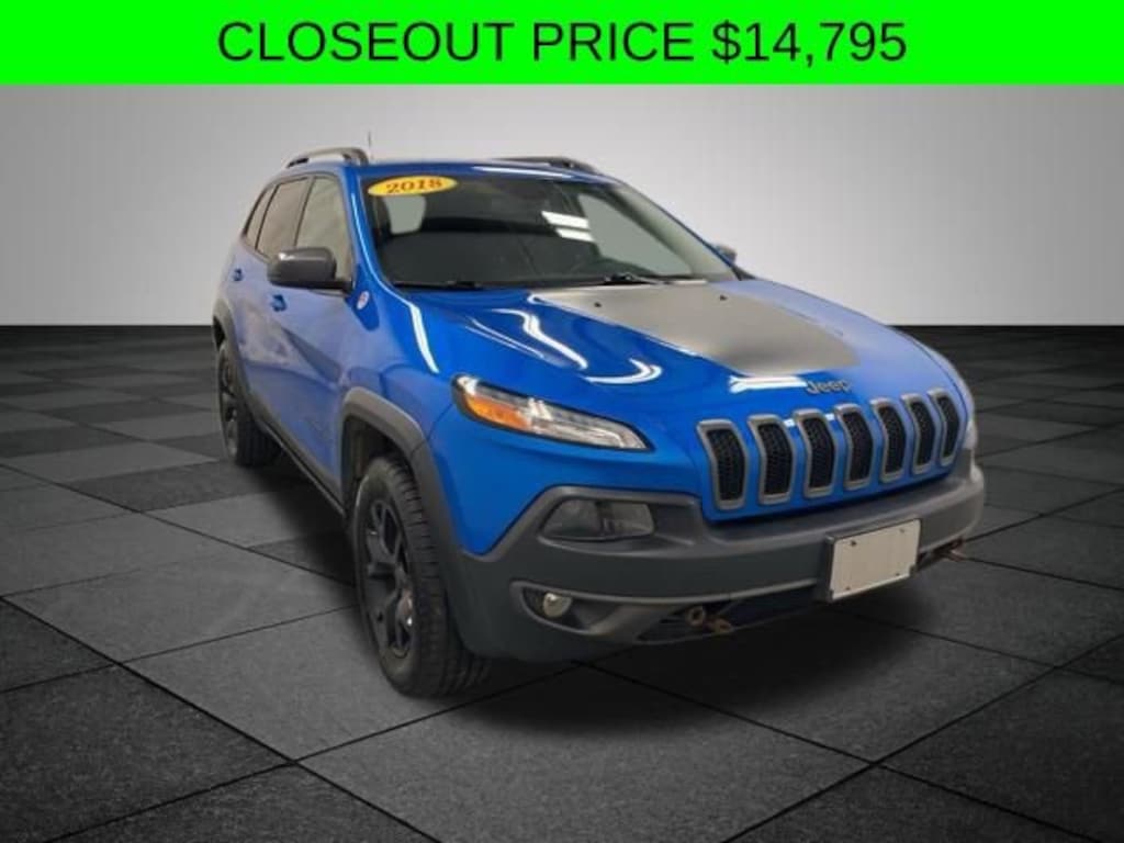 Hydro Blue Pearlcoat 2018 Jeep Cherokee Trailhawk 4WD 9-Speed Automatic 3.2L V6 3.517 Axle Ratio, Quick Order Package 27E, 17" x 7.5" Aluminum Wheels, 4-Wheel Disc Brakes, 4.083 Axle Ratio, 6 Speakers, 600 Amp Maintenance Free Battery, 8.4" Touchscreen Display, ABS brakes, Air Conditioning, Alloy wheels, AM/FM radio: SiriusXM, Anti-whiplash front head restraints, Automatic temperature control, Auxiliary Transmission Oil Cooler, Brake assist, Cloth/Leather/Vinyl Bucket Seats, Compass, Delay-off headlights, Driver door bin, Driver vanity mirror, Dual front impact airbags, Dual front side impact airbags, Electronic Stability Control, Emergency communication system: Uconnect Access, Engine Oil Cooler, Exterior Mirrors Courtesy Lamps, Exterior Mirrors w/Supplemental Signals, Four wheel independent suspension, Front anti-roll bar, Front Bucket Seats, Front Center Armrest, Front dual zone A/C, Front fog lights, Front License Plate Bracket, Front reading lights, Fully automatic headlights, GPS Antenna Input, Heated door mirrors, High intensity discharge headlights: Bi-Xenon, Illuminated entry, Integrated Voice Command w/Bluetooth, Knee airbag, Leather Shift Knob, Low tire pressure warning, Manufacturer's Statement of Origin, Occupant sensing airbag, Off Road Suspension, Outside temperature display, Overhead airbag, Overhead console, Panic alarm, ParkView Rear Back-Up Camera, Passenger door bin, Passenger vanity mirror, Power door mirrors, Power driver seat, Power steering, Power windows, Radio data system, Radio: Uconnect 3C w/8.4" Display, Rear anti-roll bar, Rear reading lights, Rear seat center armrest, Rear side impact airbag, Rear window defroster, Rear window wiper, Remote keyless entry, Roof rack: rails only, SiriusXM Satellite Radio, Speed control, Speed-sensing steering, Split folding rear seat, Spoiler, Steering wheel mounted audio controls, Tachometer, Telescoping steering wheel, Tilt steering wheel, Traction control, Trip computer, Turn signal indicator mirrors, Uconnect Access, Variably intermittent wipers, Voltmeter, Wheels: 17" x 7.5" Black Painted Aluminum, 3.517 Axle Ratio, Quick Order Package 27E.