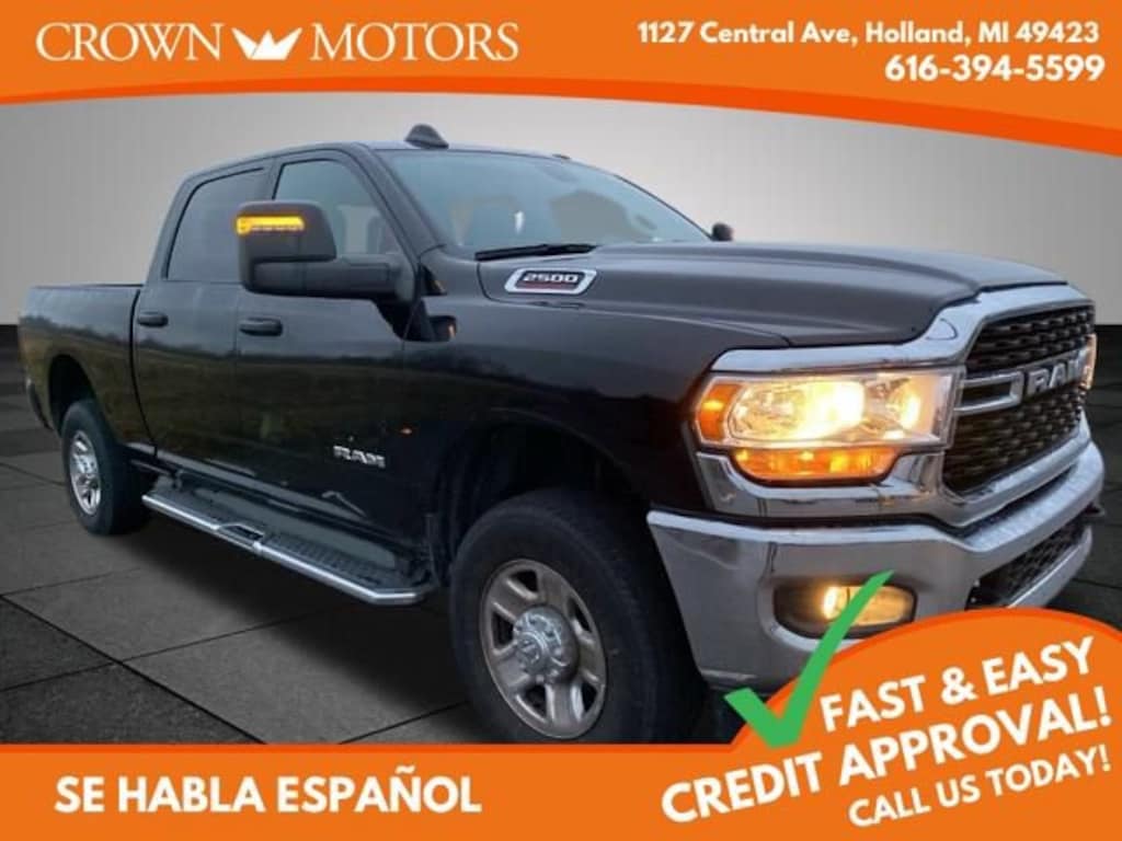Clean CARFAX. Diamond Black Crystal Pearlcoat 2024 Ram 2500 Big Horn 4WD 8-Speed Automatic 6.4L V8 2 Way Rear Headrest Seat, 3.73 Axle Ratio, 4 Way Front Headrests, 4-Wheel Disc Brakes, 40/20/40 Split Bench Seat, 6 Speakers, ABS brakes, Active Noise Control System, Air Conditioning, Anti-Spin Differential Rear Axle, Bed Utility Group, Black Exterior Mirrors, Bluetooth Handsfree Phone & Audio, Brake assist, Bumpers: chrome, Center Hub, Center Stack Storage Drawer, Chrome Flat Cab-Length Side Steps, Cloth 40/20/40 Bench Seat, Compass, Connectivity - US/Canada, Delay-off headlights, Driver door bin, Dual front impact airbags, Dual front side impact airbags, Electronic Stability Control, Electronically Controlled Throttle, Emergency communication system: SiriusXM Guardian, Exterior Mirrors w/Heating Element, Front anti-roll bar, Front Center Armrest w/Storage, Front Fog Lamps, Front License Plate Bracket, Front reading lights, Fully automatic headlights, Global Telematics Box Module (TBM), GPS Antenna Input, Heated door mirrors, Illuminated entry, Integrated Center Stack Radio, Integrated Voice Command w/Bluetooth, LED Bed Lighting, Low tire pressure warning, Manual Adjust 4-Way Driver Seat, Manufacturer's Statement of Origin, MOPAR Deployable Bed Step, MOPAR Spray In Bedliner, Occupant sensing airbag, Outside temperature display, Overhead airbag, Overhead console, Panic alarm, ParkView Rear Back-Up Camera, Passenger door bin, Passenger vanity mirror, Power 2-Way Driver Lumbar Adjust, Power Adjust Mirrors, Power door mirrors, Power steering, Power windows, Protection Group, Quick Order Package 2GZ Big Horn, Radio data system, Radio: Uconnect 3 w/5" Display, Radio: Uconnect 5 W w/8.4" Display, Rear anti-roll bar, Rear Folding Seat, Rear seat center armrest, Rear step bumper, Remote keyless entry, SiriusXM Radio Service, Speed control, Tachometer, Tilt steering wheel, Tip Start, Tow Hooks, Traction control, Trip computer, Turn signal indicator mirrors, Variably intermittent wipers, Voltmeter, Wheels: 18" x 8.0" Steel Chrome Clad.