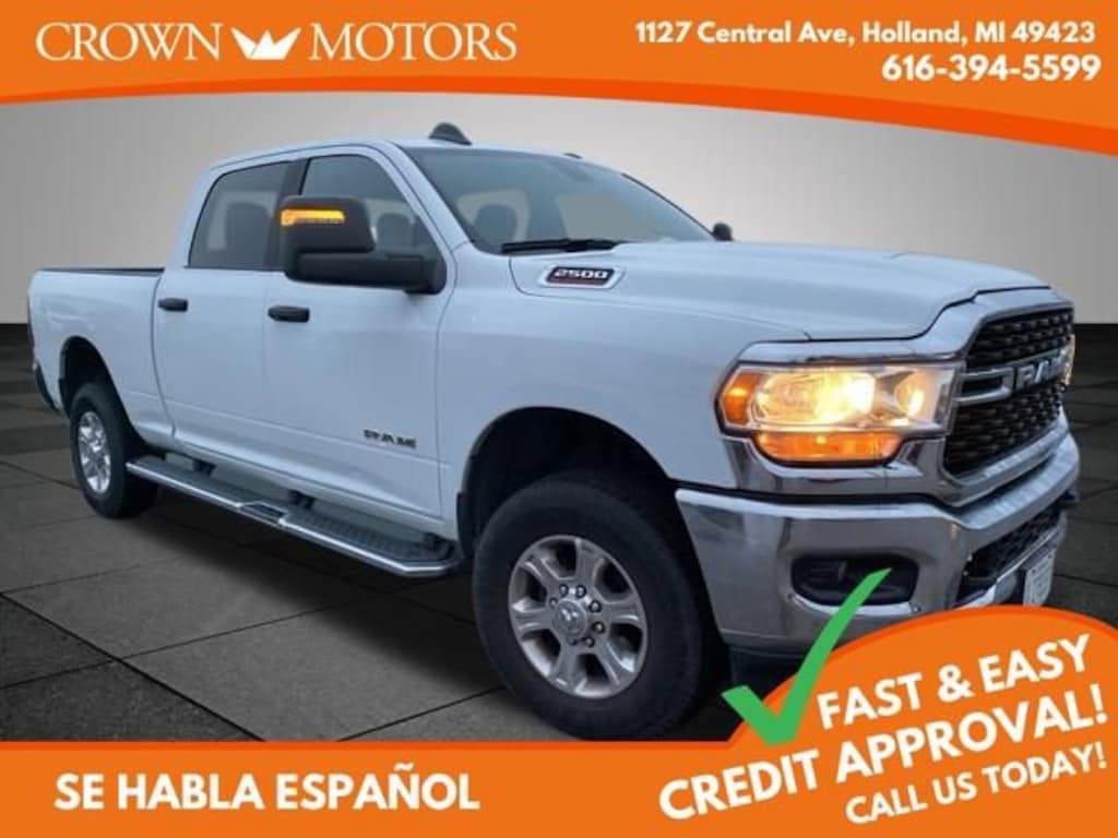 Clean CARFAX. Bright White Clearcoat 2024 Ram 2500 Big Horn 4WD 8-Speed Automatic 6.4L V8 2 Way Rear Headrest Seat, 2nd Row In Floor Storage Bins, 3.73 Axle Ratio, 4 Way Front Headrests, 4-Wheel Disc Brakes, 40/20/40 Split Bench Seat, 4G LTE Wi-Fi Hot Spot, 6 Speakers, 8.4" Touchscreen Display, 9 Alpine Speakers w/Subwoofer, ABS brakes, Active Noise Control System, Air Conditioning, Anti-Spin Differential Rear Axle, Apple CarPlay, Auto Power-Folding Mirrors, Bed Utility Group, Big Horn IP Badge, Black Exterior Mirrors, Bluetooth Handsfree Phone & Audio, Brake assist, Bumpers: chrome, Center Hub, Center Stack Storage Drawer, Chrome Flat Wheel-to-Wheel Side Steps, Cloth 40/20/40 Bench Seat, Compass, Connectivity - US/Canada, Delay-off headlights, Driver door bin, Dual front impact airbags, Dual front side impact airbags, Dual Glove Boxes, Electronic Stability Control, Electronically Controlled Throttle, Emergency communication system: SiriusXM Guardian, Exterior Mirrors Courtesy Lamps, Exterior Mirrors w/Heating Element, Exterior Mirrors w/Supplemental Signals, Foam Bottle Insert (Door Trim Panel), Footwell Courtesy Lamp, For Details, Visit DriveUconnect.com, For More Info, Call 800-643-2112, Forward & Reverse Utility Lights, Front anti-roll bar, Front Armrest w/Cupholders, Front Center Armrest w/Storage, Front Center Seat Cushion Storage, Front Fog Lamps, Front License Plate Bracket, Front reading lights, Front Seat Back Map Pockets, Fully automatic headlights, Global Telematics Box Module (TBM), Glove Box Lamp, Google Android Auto, GPS Antenna Input, Heated door mirrors, Illuminated entry, Integrated Center Stack Radio, Integrated Voice Command w/Bluetooth, Leather Wrapped Steering Wheel, LED Bed Lighting, Level 1 Equipment Group, Locking Lower Glove Box, Low tire pressure warning, Manual Adjust 4-Way Driver Seat, Manual Adjust 4-Way Front Passenger Seat, Manufacturer's Statement of Origin, Mirror Running Lights, MOPAR Deployable Bed Step, MOPAR Spray In Bedliner, Occupant sensing airbag, Outside temperature display, Overhead airbag, Overhead console, Panic alarm, ParkView Rear Back-Up Camera, Passenger door bin, Passenger vanity mirror, Power 2-Way Driver Lumbar Adjust, Power Adjust 8-Way Driver Seat, Power Adjust Mirrors, Power Adjustable Convex Aux Mirrors, Power door mirrors, Power Heated Fold Telescope Mirrors, Power steering, Power Telescoping Mirrors, Power windows, Premium Cloth 40/20/40 Bench Seat (DISC), Protection Group, Quick Order Package 2GZ Big Horn, Radio data system, Radio: Uconnect 3 w/5" Display, Radio: Uconnect 5 W w/8.4" Display, Rear 60/40 Folding Seat, Rear anti-roll bar, Rear Dome w/On/Off Switch Lamp, Rear Folding Seat, Rear seat center armrest, Rear step bumper, Remote keyless entry, Remote USB Port - Charge Only, Selectable Tire Fill Alert, SiriusXM Radio Service, SiriusXM Satellite Radio, Speed control, Steering Wheel Mounted Audio Controls, Storage Tray, Tachometer, Tilt steering wheel, Tip Start, Tow Hooks, Traction control, Trip computer, Turn signal indicator mirrors, Variably intermittent wipers, Voltmeter, Wheels: 18" x 8.0" Polished Aluminum, Wheels: 18" x 8.0" Steel Chrome Clad.