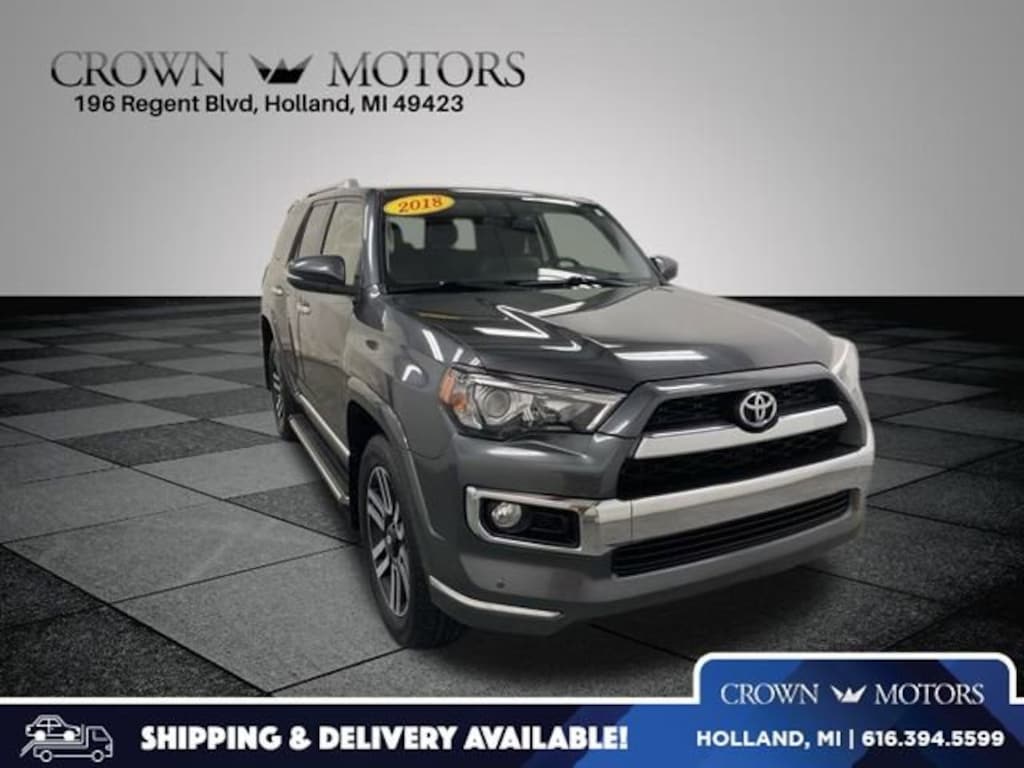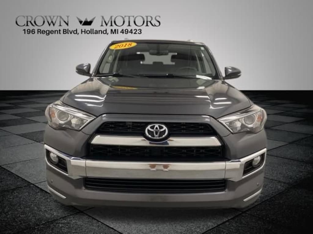 Clean CARFAX. Magnetic Gray 2018 Toyota 4Runner Limited 4WD 5-Speed Automatic with Overdrive 4.0L V6 SMPI DOHC **ACCIDENT FREE**, **LOCAL TRADE IN**, 4WD, Graphite Leather, 15 Speakers, 20" x 7.5" Unique Dual 6-Spoke Alloy Wheels, 3.727 Axle Ratio, 4-Wheel Disc Brakes, ABS brakes, Air Conditioning, All-Weather Floor Liners & Cargo Tray, Alloy wheels, AM/FM radio: SiriusXM, Anti-whiplash front head restraints, Auto-Dimming Rear-View Mirror, Auto-dimming Rear-View mirror, Automatic temperature control, Body Color Heated Mirrors, Brake assist, Bumpers: body-color, CD player, Compass, Delay-off headlights, Door Edge Guards, Driver door bin, Driver vanity mirror, Dual front impact airbags, Dual front side impact airbags, Electronic Stability Control, Emergency communication system: Safety Connect, Exterior Parking Camera Rear, Front anti-roll bar, Front Bucket Seats, Front Center Armrest, Front dual zone A/C, Front fog lights, Front reading lights, Front wheel independent suspension, Fully automatic headlights, Garage Door Opener, Garage door transmitter: HomeLink, Heated door mirrors, Heated front seats, Heated/Ventilated Front Bucket Seats, Illuminated entry, Knee airbag, Leather Seat Trim, Leather Shift Knob, Limited Package, Low tire pressure warning, Memory seat, Moonroof w/Tilt Up & Slide, Mudguards, Navigation System, Occupant sensing airbag, Outside temperature display, Overhead airbag, Overhead console, Panic alarm, Passenger door bin, Passenger vanity mirror, Power door mirrors, Power driver seat, Power moonroof, Power passenger seat, Power steering, Power windows, Radio: Entune Premium JBL Audio w/Navigation, Rear anti-roll bar, Rear seat center armrest, Rear window defroster, Rear window wiper, Remote keyless entry, Right & Left Individual Air Conditioner, Roof rack: rails only, Running Boards, Security system, Speed control, Speed-sensing steering, Split folding rear seat, Spoiler, Steering wheel mounted audio controls, Tachometer, Telescoping steering wheel, Tilt steering wheel, Traction control, Trip computer, Trunk Carpet, Turn signal indicator mirrors, Variably intermittent wipers, Ventilated front seats, 4WD, Graphite Leather.